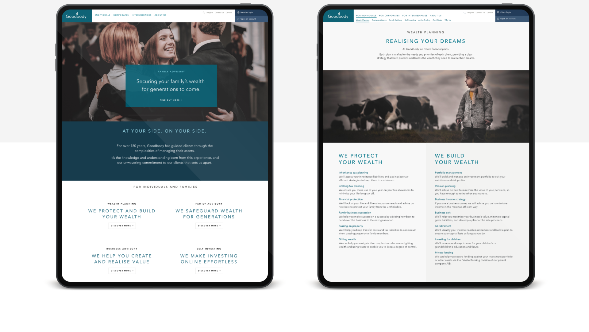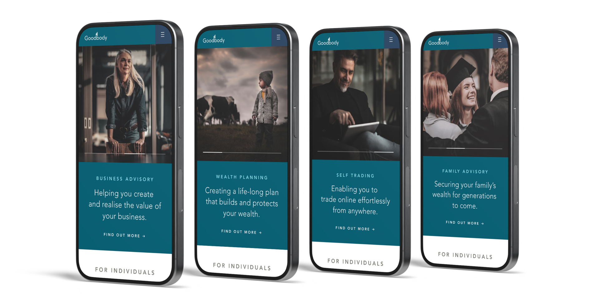 The first expression of the revitalised brand was a new website, designed around key audience groups and showcasing Goodbody’s expertise and services.