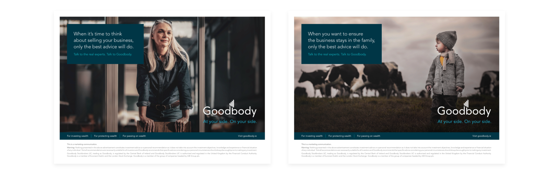 To bring this to life, we introduced a bold photographic style that reinforces Goodbody’s client-centric approach, alongside a confident new tone of voice and a refreshed brand colour palette.