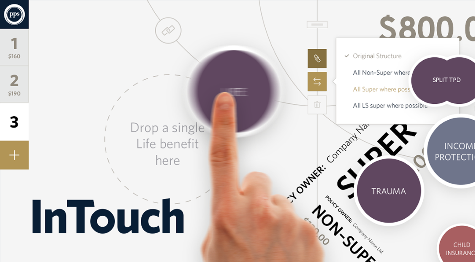 The InTouch quote-builder let accredited IFAs create bespoke protection quotes using a delightfully intuitive drag-and-drop action. And it lets them do it right there in front of the client, in real time.